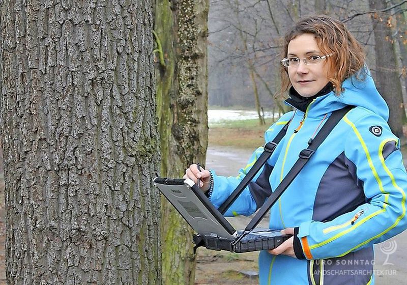 Stefanie Sonntag überprüft einen mehr als hundertjährigen Baum an der Bleyerwiese in Branitz. Foto: Elsner Stefanie Sonntag überprüft einen mehr als hundertjährigen Baum an der Bleyerwiese in Branitz. Foto: Elsner