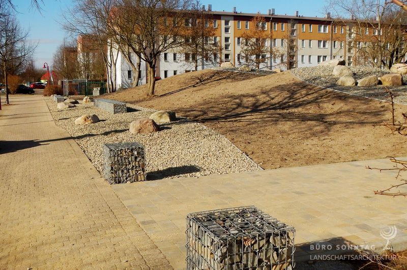 Gestaltungshöhepunkt bildet der Findlings-hügel, der als Wind- und Sichtschutz dient und in Zusammenarbeit mit dem Findlingspark Nochten, vertreten durch Herrn Dr. Ulbrich geplant wurde. Er ist in verschiedene Zonen mit Schotter und Rasen geteilt. Die Schotterflächen erhalten im Frühjahr eine trockenheitsresistente Bepflanzung.