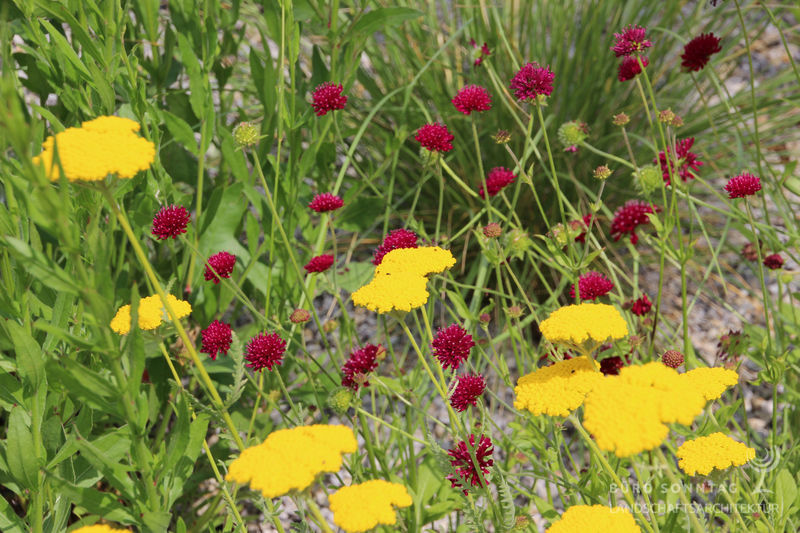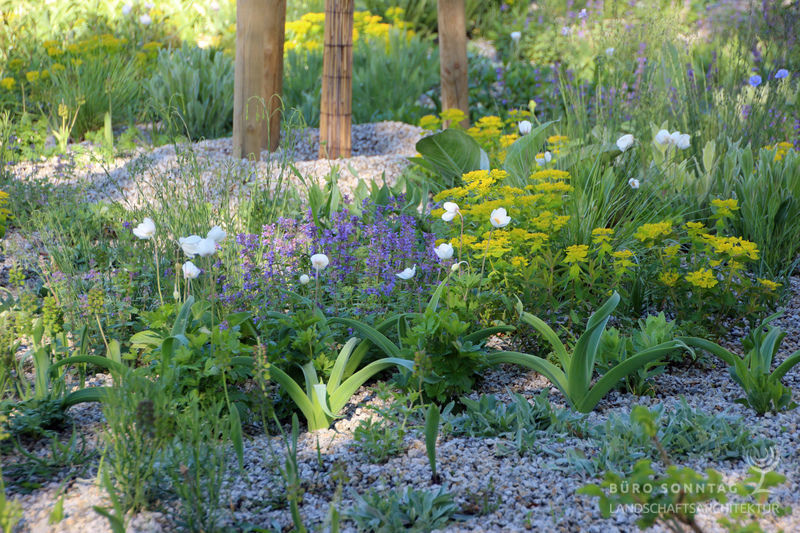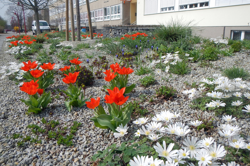 Aus den genannten Gründen sollte das Gesamtbild freundlich, einladend und zugleich pflegeleicht gestaltet werden. Den zentralen Bereich bildet jetzt eine bunte Splitt-Staudenpflanzung mit zahlreichen Frühblühern und einer mittig stehenden Himalaja-Birke, deren besonderes Kennzeichen die strahlend weiße Rinde ist.