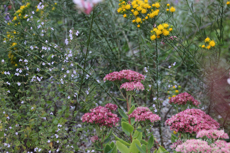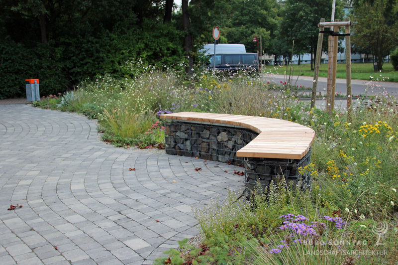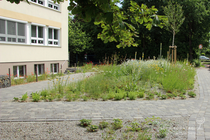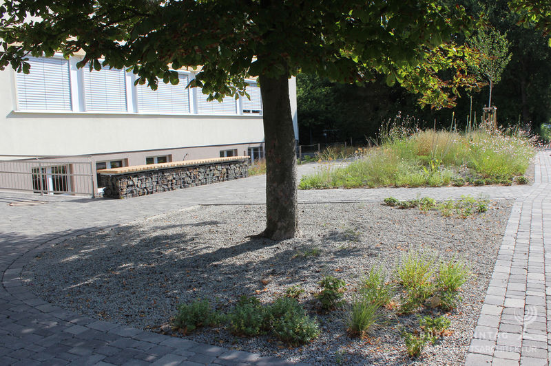 Eine Bodenmodellierung lockert den Bereich auf. Der Verbindungsweg zwischen Schulhof und Schulvorderseite wurde verbreitert. Sitzgabionen garantieren hier einen Aufenthaltsbereich. Weiterhin wurde die ehemaligen Böschung durch 2 Gabionenreihen stufig gestaltet und mit Thymian und anderen trockenheitsverträglichen Bodendeckern begrünt. Dünenrosen ersetzen eine aufwendige Absturzsicherung. Der Pflegeweg und Zugang zum Wasserhahn erfuhr eine Befestigung durch Recyclingmaterial und Splitt. Auf eine Teilversiegelung durch Gehwegplatten wurde aufgrund der geringen Nutzung verzichtet.