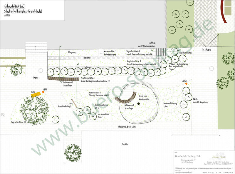 Ziel war eine einladende Gestaltung des Vorderbereiches der Grundschule Boxberg/ O.L. Dieser Bereich stellte sich zur Zeit der Planung düster und abschreckend dar. Hochgewachsene Stechfichten nahmen der Schule das Licht. Die Böschung war schwer zu pflegen, die Kastanie war in einem Pflasterring gefangen und durch die oberflächennahen Wurzeln wurde das Pflaster zu einer Stolperfalle.