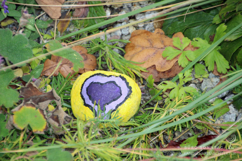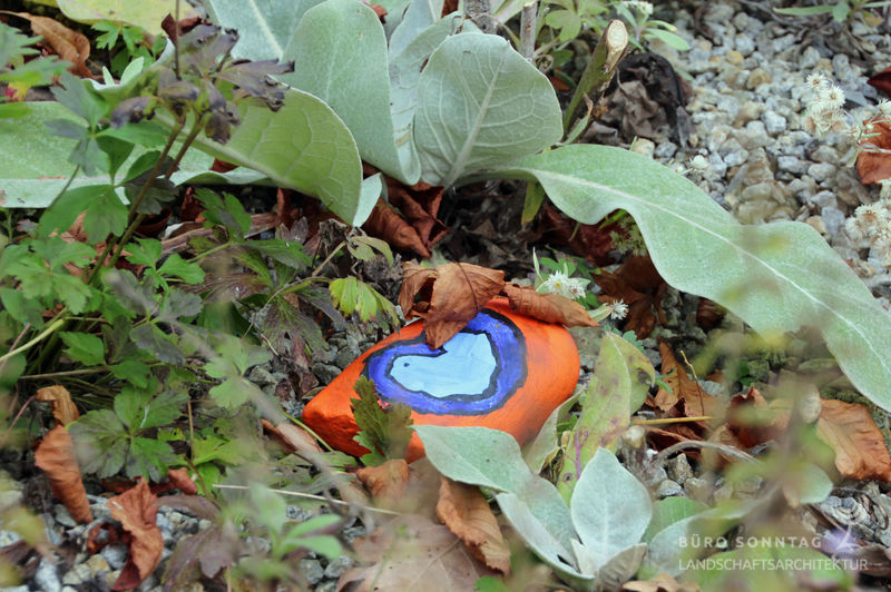 Die Kastanie steht mitten im stark begangenen Zugangsbereich der Schule. Der Einbau einer Wurzelbrücke war aufgrund der oberflächennahen Wurzeln nicht möglich. Aus diesem Grund wurde ein Splittbelag gewählt. Nach einem Jahr intensiver Nutzung fällt die Bilanz trotz anfänglicher Skepsis der Beteiligten positiv aus. Die Staudenfläche blüht innerhalb der Vegetationsperiode bunt, hat den sehr trockenen Sommer 2013 sehr gut überstanden und die Kinder haben überall im Beet bemalte Steine mit Herzen verteilt.